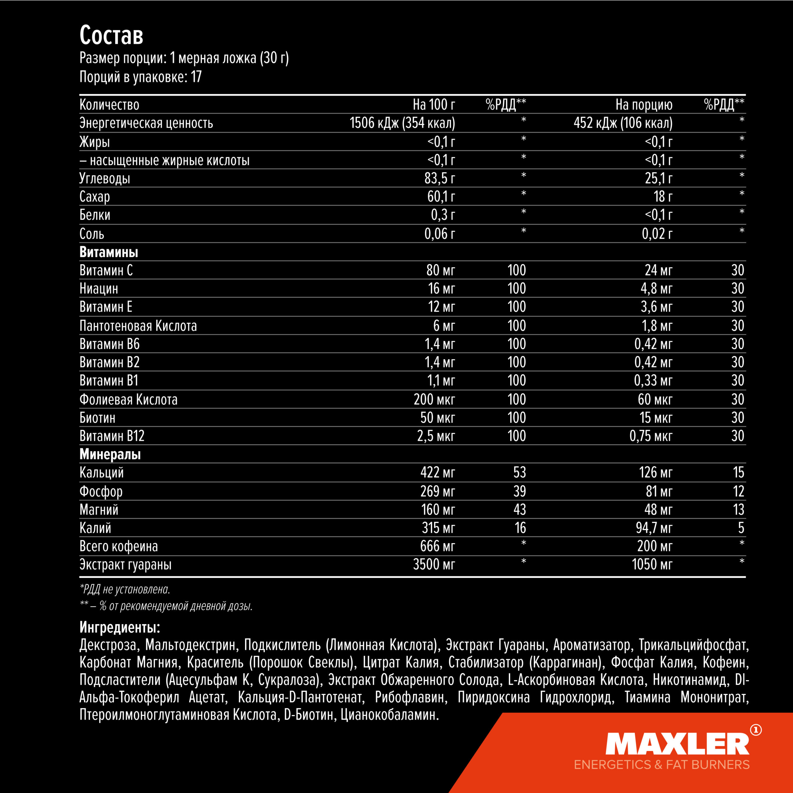 Состав: Декстроза, Мальтодекстрин, Подкислитель (Лимонная Кислота), Экстракт Гуараны, Ароматизатор, Трикальцийфосфат, Карбонат Магния, Краситель (Порошок Свеклы), Цитрат Калия, Стабилизатор (Каррагинан), Фосфат Калия, Кофеин, Подсластители (Ацесульфам К, Сукралоза), Экстракт Обжаренного Солода, L-Аскорбиновая Кислота, Никотинамид, Dl-Альфа-Токоферил Ацетат, Кальция-D-Пантотенат, Рибофлавин, Пиридоксина Гидрохлорид, Тиамина Мононитрат, Птероилмоноглутаминовая Кислота, D-Биотин, Цианокобаламин.