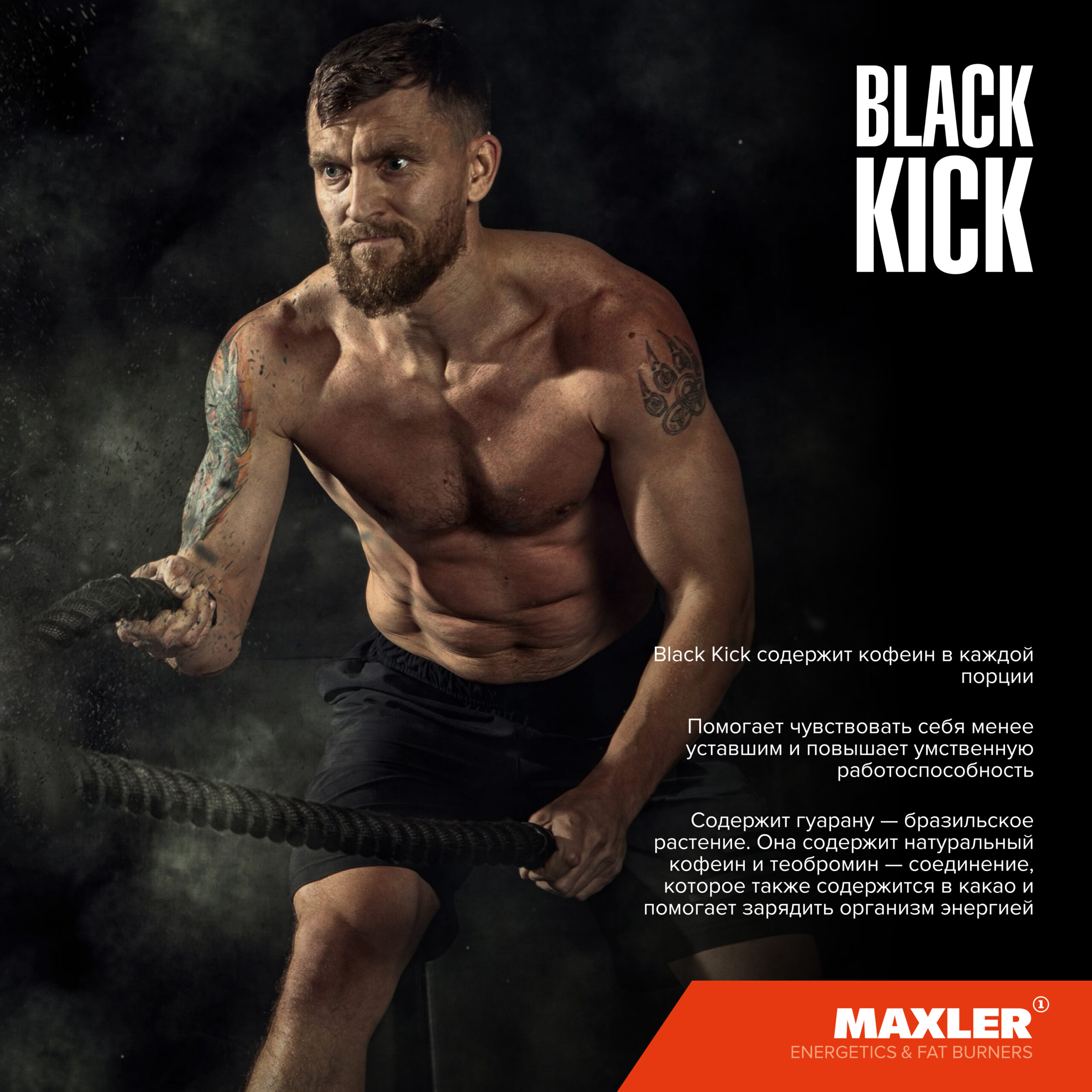 Black Kick содержит 192 мг кофеина в каждой порции. Он помогает чувствовать себя менее уставшим и повышает умственную работоспособность, если вы занимаетесь спортом, требующим быстрой реакции. Наряду с кофеином, Black Kick содержит гуарану — бразильское растение. Она содержит натуральный кофеин и теобромин — соединение, которое также содержится в какао и помогает зарядить организм энергией.