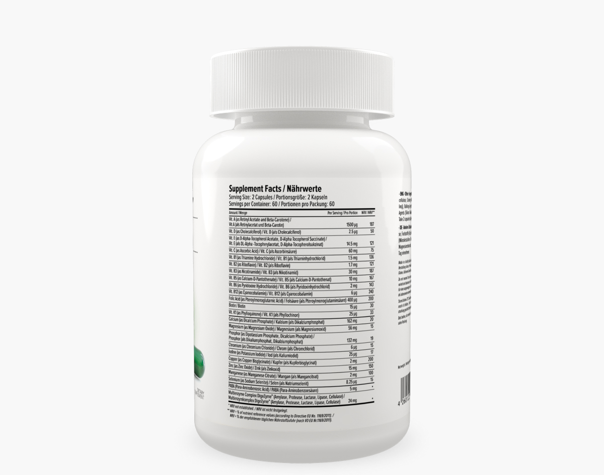 Ingredients: Di-Calcium Phosphate, Capsule (Hydroxypropyl Methyl Cellulose, Coloring Agent (Copper Complex Of Chlorophyllins)), Ascorbic Acid (Vit. C), Pteroylmonoglutamic Acid (Vit. B9 (Folic Acid)), Nicotinamide (Vit. B3), D-Alpha-Tocopheryl Acetate (Vit. E), D-Calcium Pantothenate (Vit. B5), Retinyl Acetate (Vit. A Acetate), D-Alpha Tocopherol Succinate (Vit. E Succinate), Cyanocobalamin (Vit. B12), Beta-Carotene (Vit. A), Pyridoxine Hydrochloride (Vit. B6), Thiamine Hydrochloride (Vit. B1), Riboflavin (Vit. B2), Cholecalciferol (Vit. D3), Biotin (Vit. B8), Phylloquinone (Vit. K1), Bulking Agent (Microcrystalline Cellulose), Magnesium Oxide, Multienzyme Complex Digezyme® (Amylase, Protease, Cellulase, Lipase, Lactase), Di-Potassium Phosphate, Zinc Oxide, Anti-Caking Agents (Silicon Dioxide, Magnesium Stearate), Copper Bisglycinate, Manganese Citrate, Para-Amino Benzoic Acid (Paba), Chromium Chloride, Sodium Selenite, Potassium Iodide.