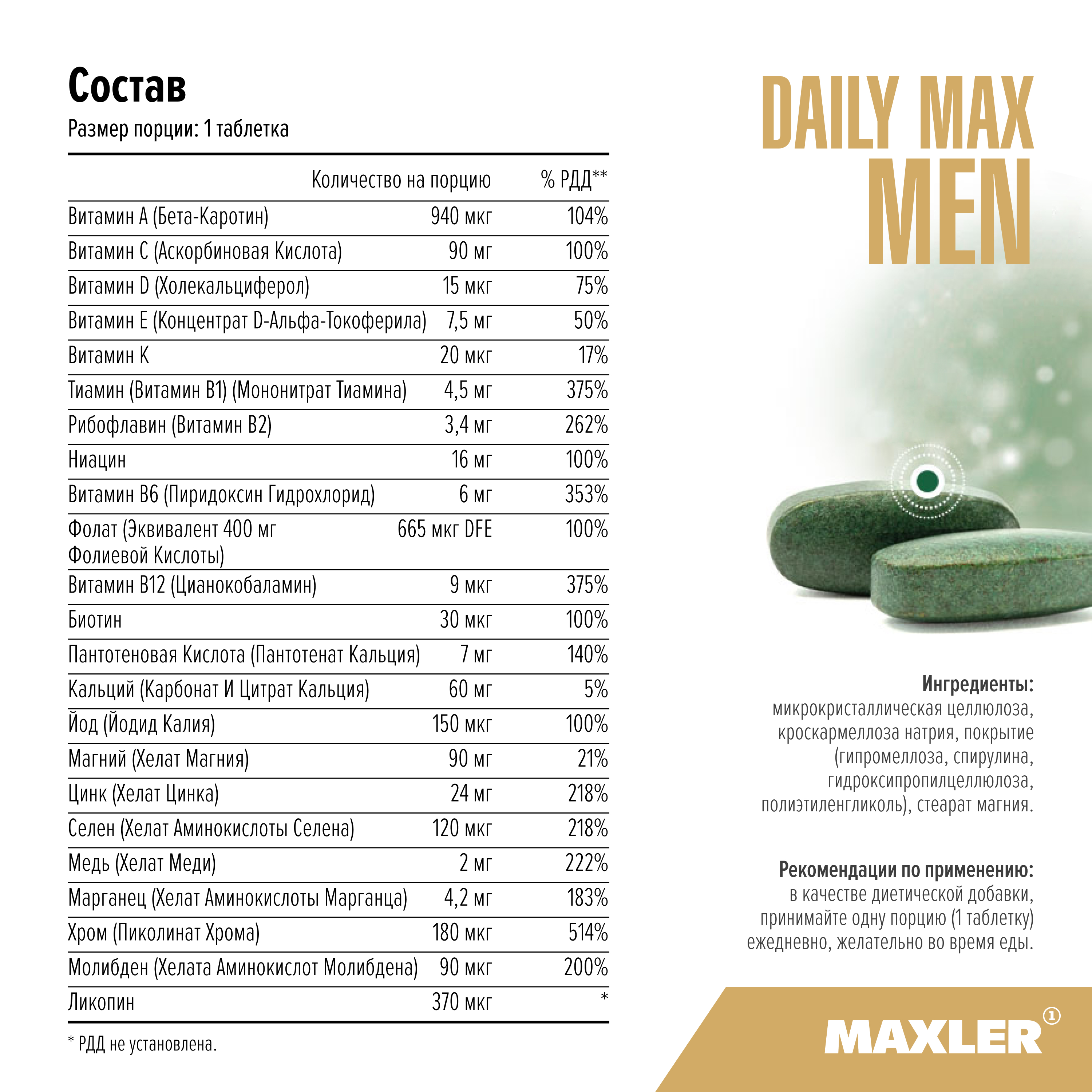 With increased physical activity, the body draws on an increased amount of resources, including vitamins and minerals. The most important for those engaged in physical activity are calcium, zinc, magnesium, B vitamins and vitamin D, as well as some antioxidants such as vitamins C and E, beta-carotene and selenium. Daily Max Men contains all of these components.