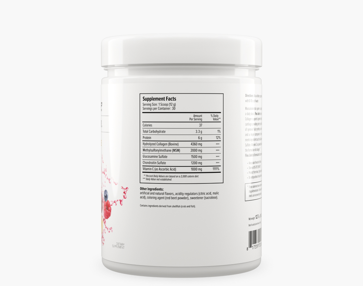 Flex Joint содержит чистый гидролизованный коллаген высшего качества I-го и III-го типов. Коллаген I-го типа отвечает за здоровье кожи, способствует эластичности и гибкости связок, увеличивает прочность костей и заметно снижает риски трещин и переломов, а коллаген III-го типа улучшает состояние мышц и внутренних органов.