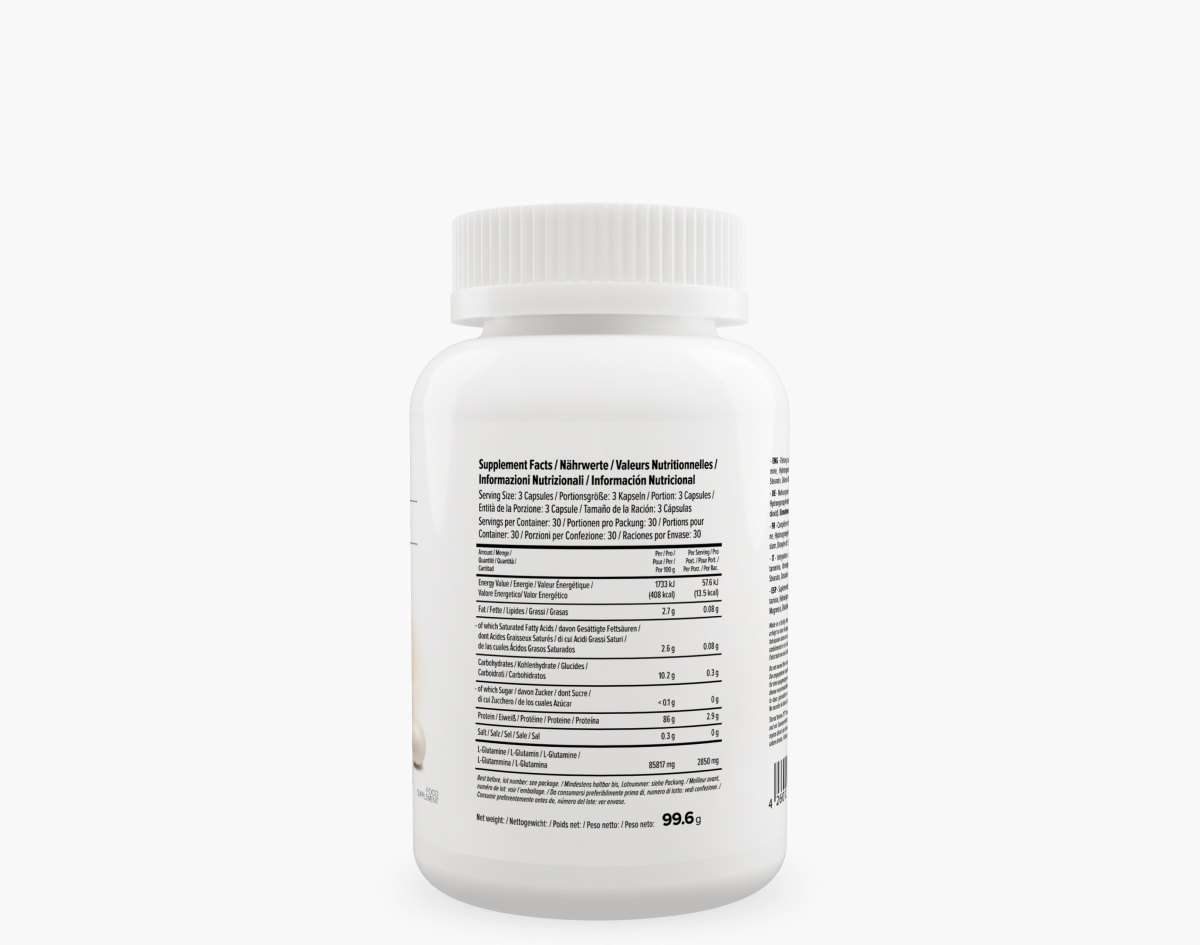 Glutamine caps is the amino acid l-glutamine in capsule form. Each serving of Glutamine helps support muscle recovery, strengthen the immune system and improve the body composition. For Glutamine caps, we only use a free and pure form of l-glutamine, which significantly increases the bioavailability of the product. The product is vegan and does not contain any genetically engineered ingredients.