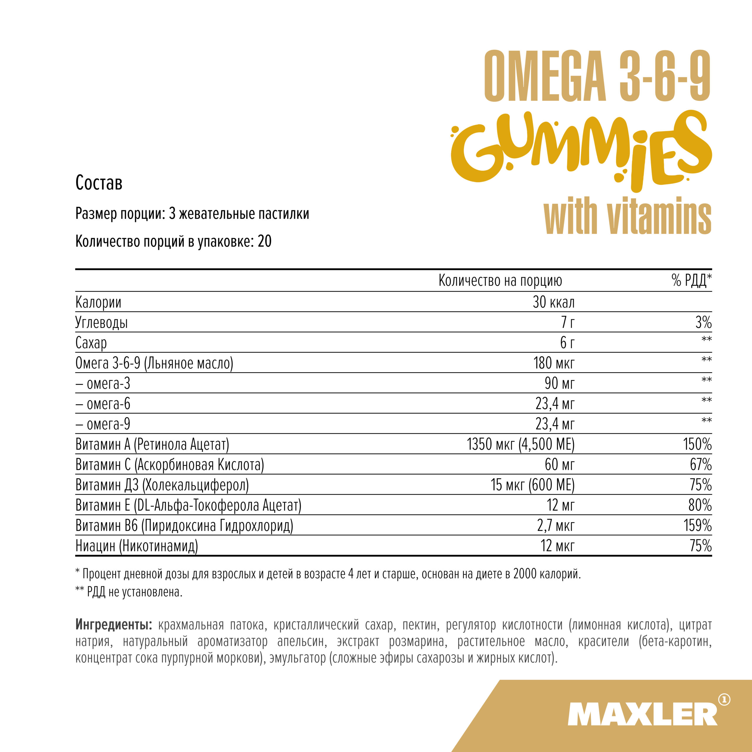 Сбалансированное питание включает в себя разнообразные продукты, чтобы обеспечить поступление в организм необходимых витаминов и жирных кислот. Они поддерживают работу нашего организма, поскольку играют важную роль во многих клеточных процессах. Maxler Omega 3-6-9 Gummies with Vitamins сочетает в себе эти два компонента в форме вкусных жевательных пастилок.