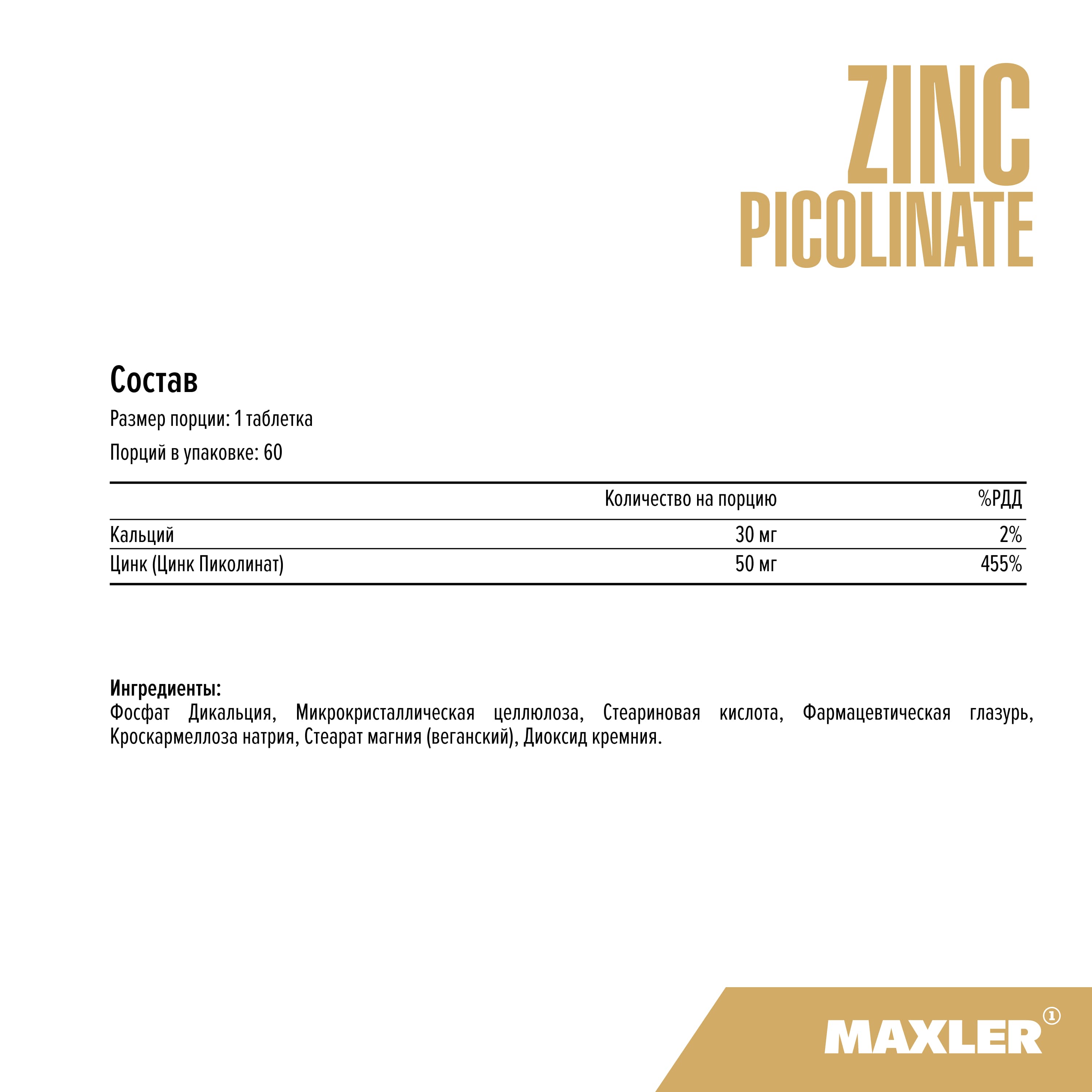 Directions: Take 1 tablet of Zinc Picolinate 50 mg a day, preferably with a meal. To achieve the best results, take the supplement for 30 days. Make Maxler’s new Zinc Picolinate 50 mg formula a healthy addition to your diet – and it would become a reliable guardian of your immune system!